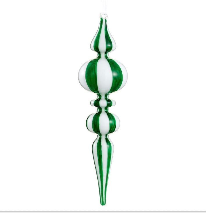 Elevate your tree with this striking 10” finial, featuring a vivid green and crisp white palette in a swirling silhouette. Its sculptural shape adds vertical interest and a touch of vintage elegance to your holiday decor.