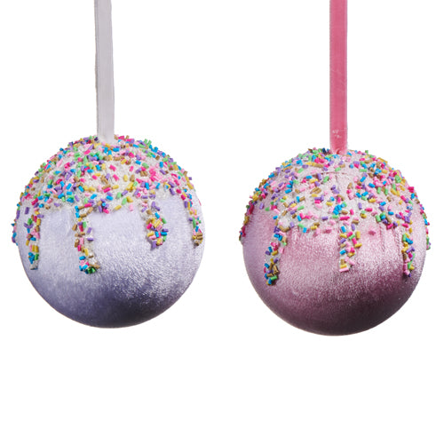 Sweeten your holiday décor with this 4" frosted sprinkle ornament, available in pink or white. Each velvet-finish ornament is topped with colorful faux sprinkles for a whimsical, candy-inspired look — perfect for playful and Sugar Plum–themed trees.