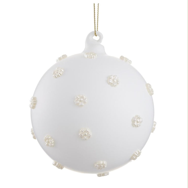 A timeless classic with a touch of glam. This 4” pearlized glass ornament features a soft, satin-like finish adorned with delicate pearl clusters, adding subtle elegance to your holiday décor. Its neutral tone complements any color scheme—perfect for white Christmas themes, luxe neutrals, or soft romantic styles.