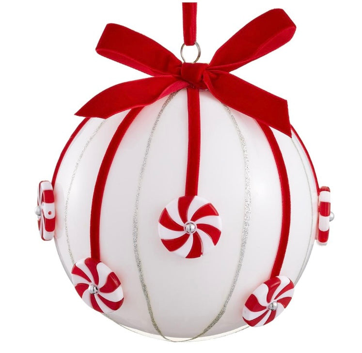 Bring sweet holiday charm to your tree with this 6” candy glass ball ornament. Featuring a soft matte white finish, red stripe detailing, peppermint candy accents, and a velvet-style bow topper, this whimsical ornament is a showstopper for any candy cane–inspired or North Pole–themed tree.