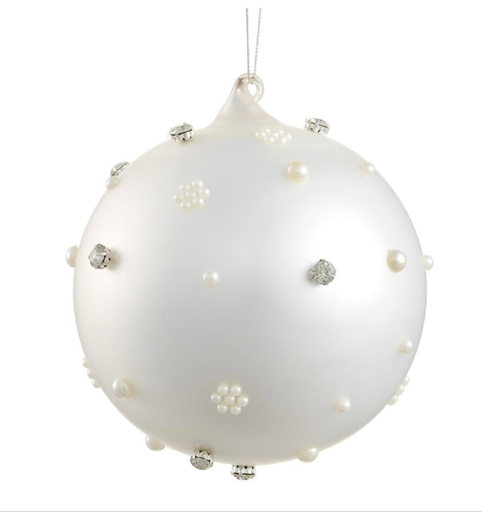 Delicate, radiant, and timeless. This 6” pearl-finished glass ornament is embellished with clusters of petite pearlescent and gem accents, adding soft shimmer and elegant texture to your holiday display.
