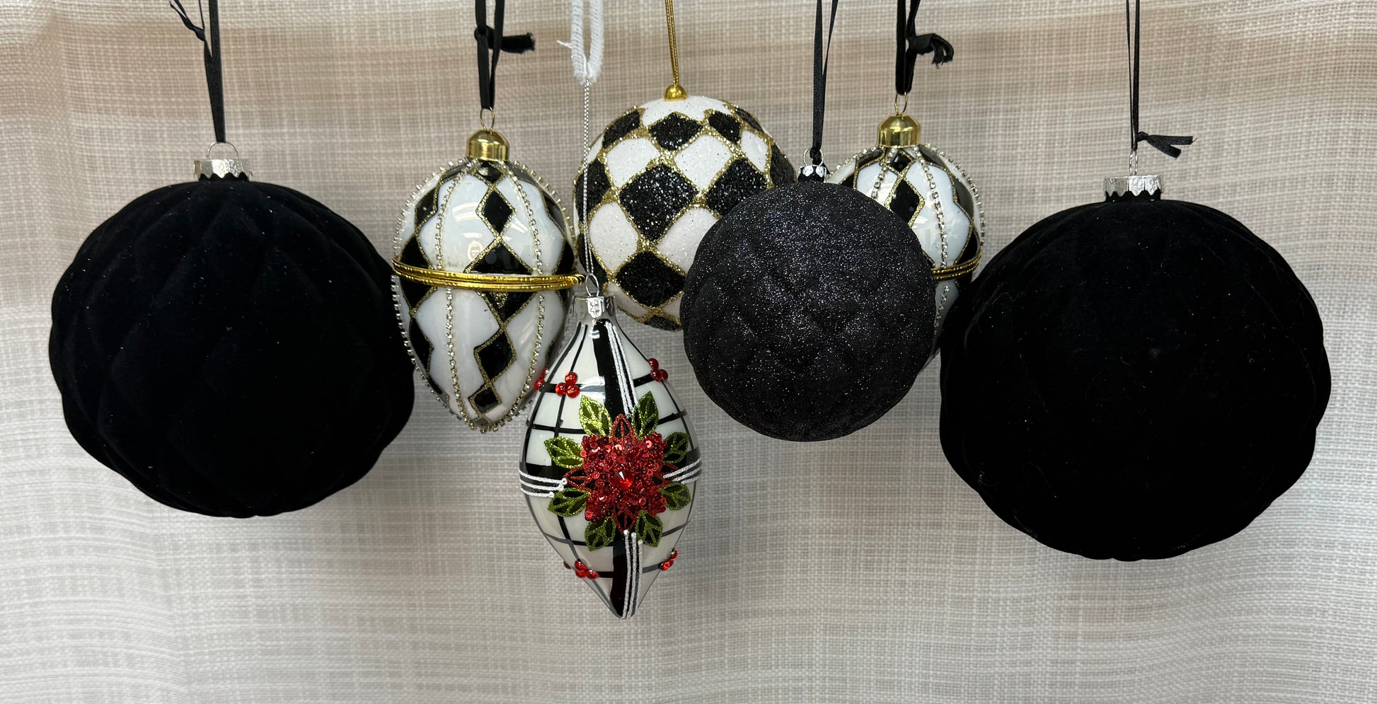 A striking collection of ornaments in a bold black, white, and gold palette. With a mix of textures from velvet to glitter and beaded detail, this set brings drama and elegance to any tree.
