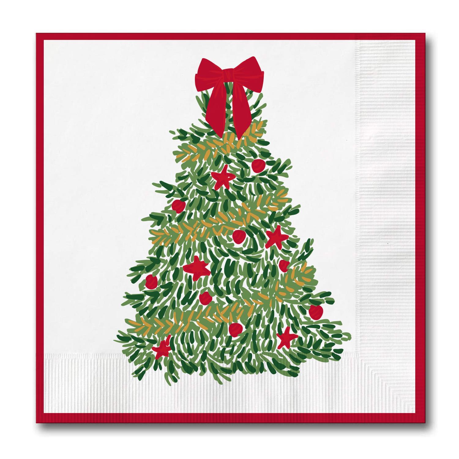 Add classic holiday charm to your celebrations with these Christmas Tree Cocktail Napkins. Featuring a beautifully illustrated evergreen decorated with red ornaments and topped with a bold red bow, this design brings a timeless Christmas feel to any gathering. A coordinating red border finishes the look.