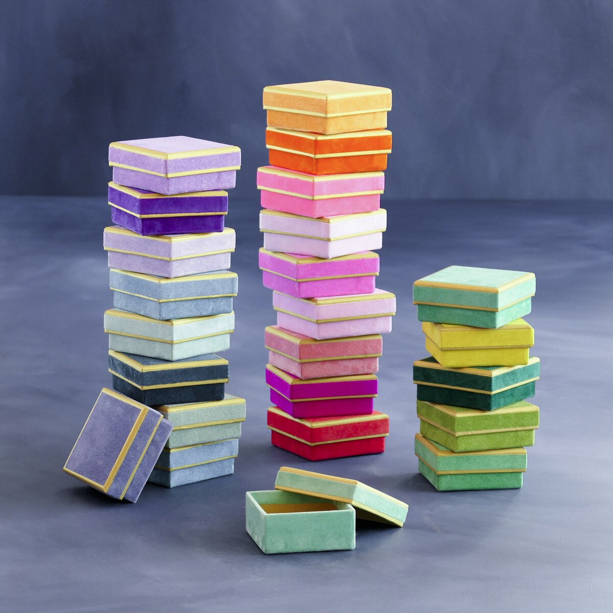 Add a touch of Glitterville luxury to your gift giving with these charming flocked boxes. Each features a soft velvet-like finish in a variety of vibrant colors, trimmed with gold edging for an elegant touch.