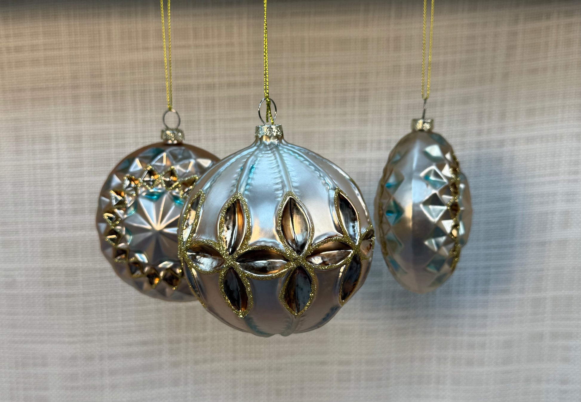 A sophisticated trio featuring elegant shapes and detailed gold trim. Includes one round ornament with floral cutout accents and two coordinating disk-shaped designs with faceted texture.