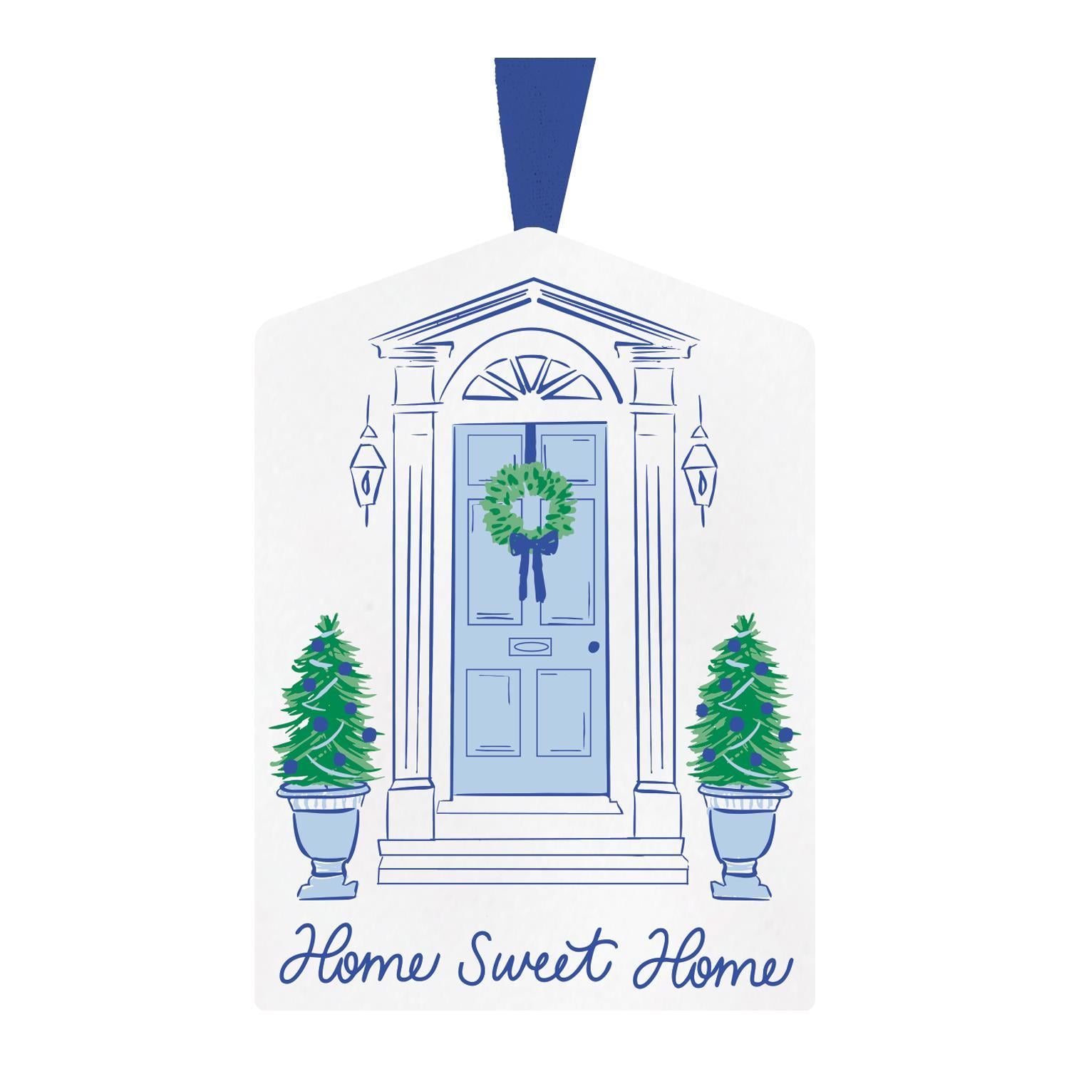 Celebrate the magic of the season with this charming “Home Sweet Home” Ceramic Ornament. Featuring a beautifully illustrated blue front door adorned with a holiday wreath and flanked by festive potted trees, this ornament brings a cozy, welcoming touch to any Christmas tree. A blue ribbon hanger adds the perfect finishing detail.