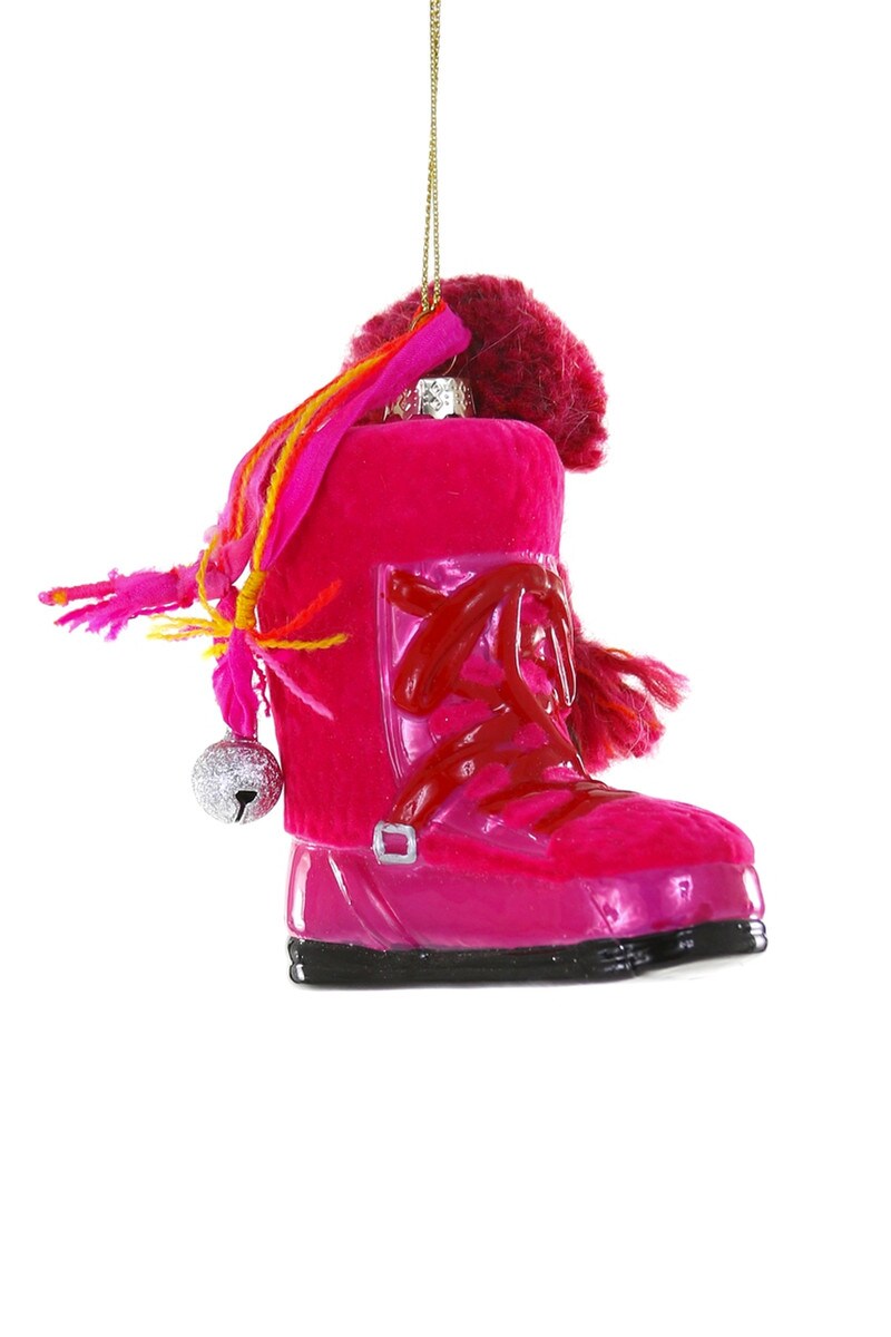Add a bold pop of color to your holiday tree with this vibrant hot pink ski boot ornament, complete with glittering details, a playful pom-pom hat, and a silver jingle bell accent. Perfect for skiers, snow lovers, or anyone who enjoys a fun, whimsical touch in their holiday décor.