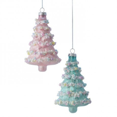 Sweeten up your holiday décor with these frosted glass tree ornaments in dreamy pastel hues. Each tree is sprinkled with candy-like beading for a whimsical, sugar-coated finish.
