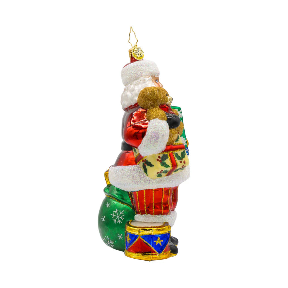 This jolly old elf is overflowing with holiday cheer and presents, proving that Santa knows how to do Christmas right. With a teddy bear, candy cane, and a whole bunch of other goodies, Santa's got enough to fill even the biggest wish list.