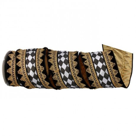 Bold, opulent, and made for the drama of the season. This stunning ribbon pairs a classic black-and-white harlequin pattern with luxe black velvet sides trimmed in intricate gold beading. Fit for a palace—or at least the most dazzling tree in town.