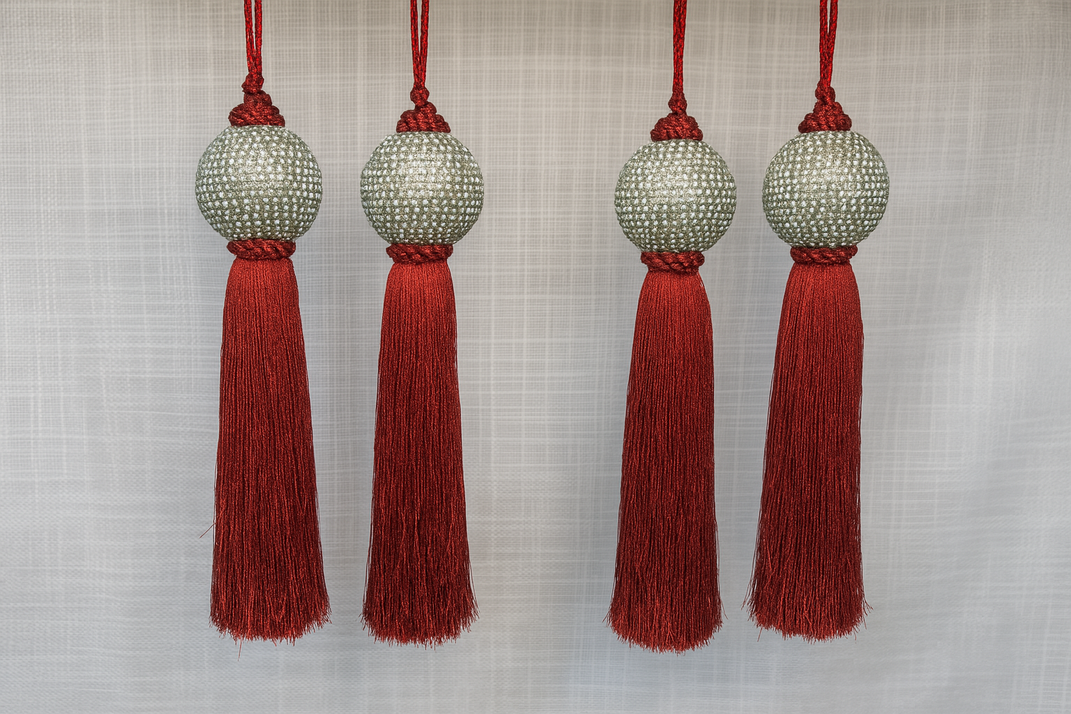 Elevate your holiday decor with this set of three luxurious tassel ornaments. Featuring a glittering silver rhinestone-covered orb and a dramatic deep red silky tassel, each ornament brings bold elegance and festive flair to your tree, garland, or gift wrapping. The rich textures and eye-catching sparkle add a glamorous touch to both traditional and modern holiday themes.