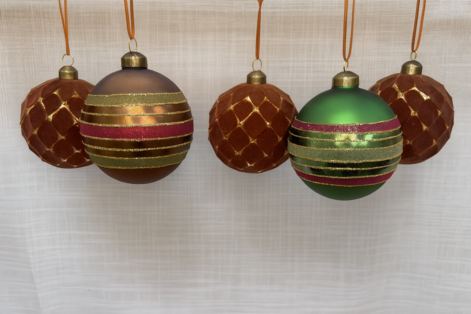Warm up your holiday décor with this cozy-chic set of five Christmas ornaments. This collection features three velvet-textured ornaments in a rich cinnamon brown diamond pattern and two satin-finish baubles-one deep bronze and one festive green-accented with sparkling gold, red, and green glitter stripes.