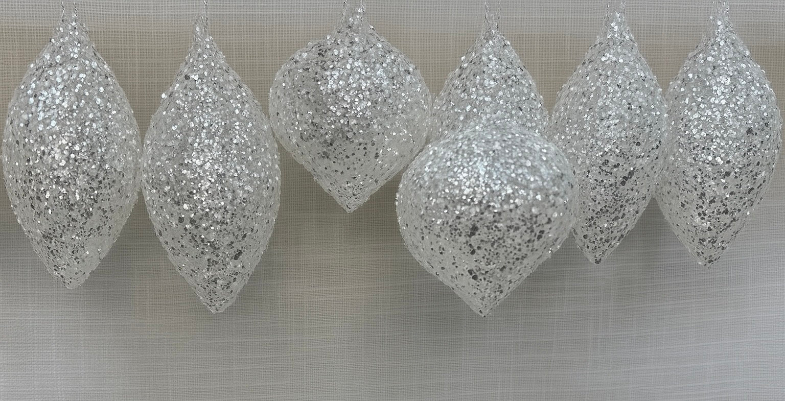 - (7) Silver glitter ornaments in assorted drop shapes