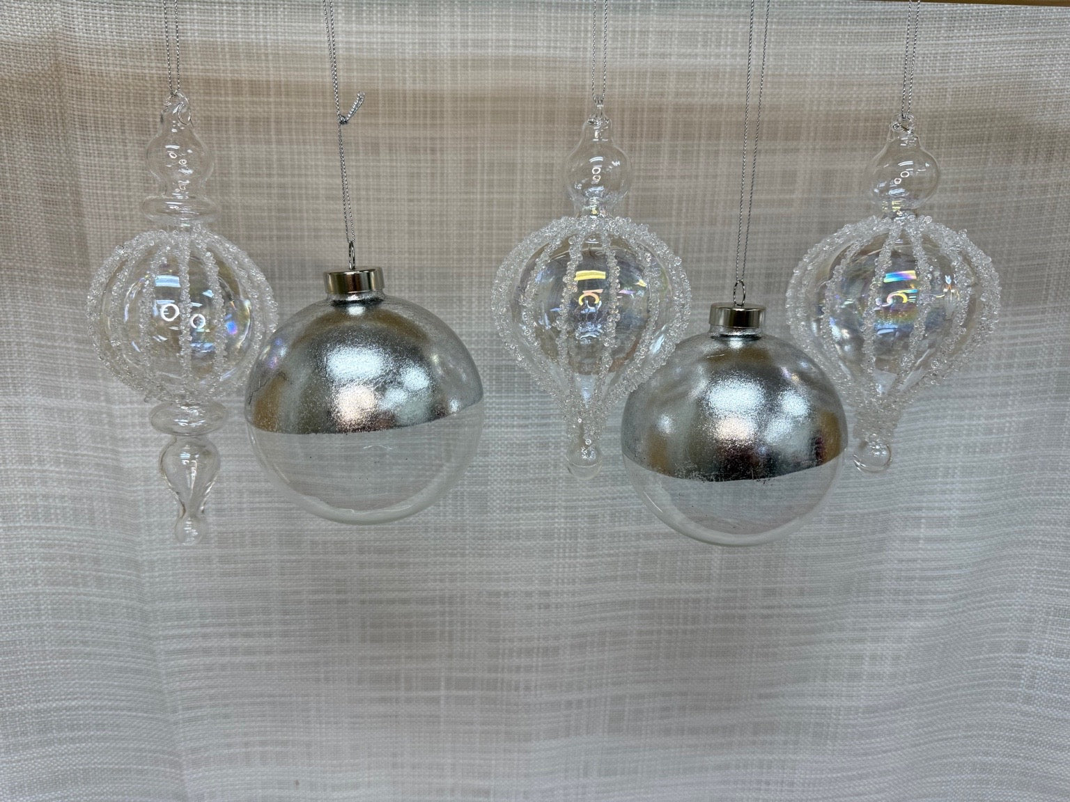 Bring refined sparkle to your holiday décor with this elegant set of five glass ornaments. The mix of frosted silver globe ornaments and intricate iridescent clear designs creates a stunning balance of shimmer and texture. Ideal for a winter wonderland theme or adding a modern, upscale touch to your tree. Lightweight and beautifully crafted, each ornament hangs effortlessly with a silver string.