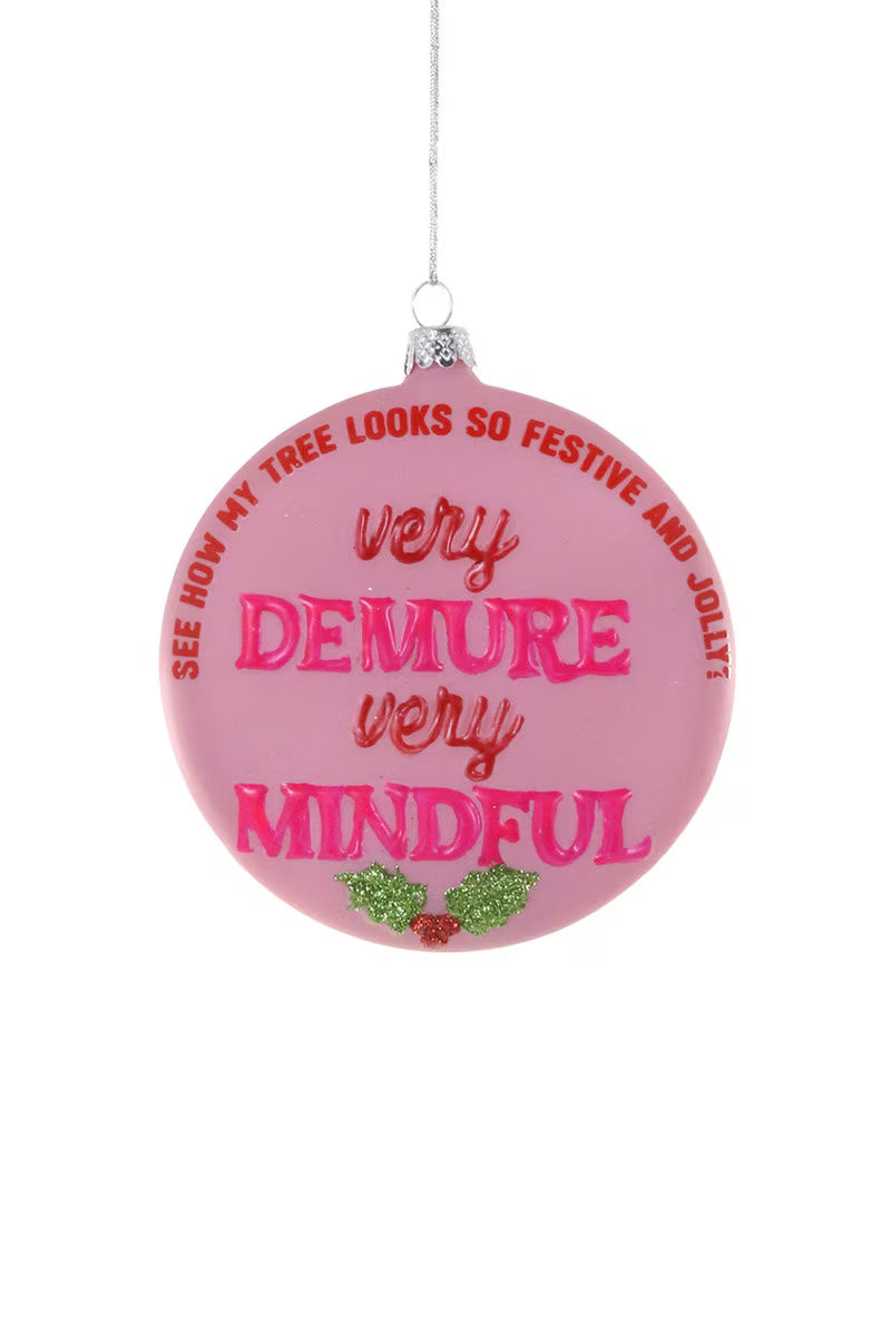 Bring a touch of sass and sparkle to your holiday décor with this playful pink ornament featuring the cheeky phrase “Very Demure Very Mindful”. Perfect for adding a pop of personality to your Christmas tree or gifting to someone with a great sense of humor.