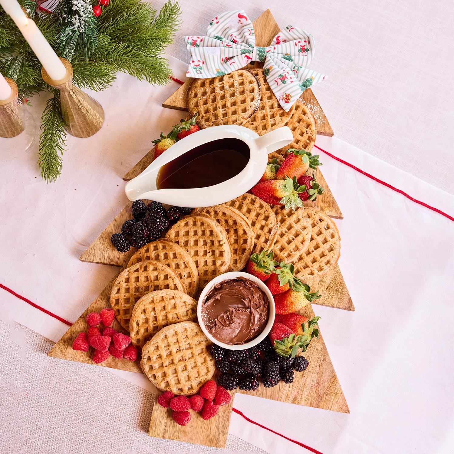 Serve your holiday favorites in the most festive way with this Wooden Christmas Tree Serving Board. Crafted in a charming tree silhouette, this board is perfect for breakfast bars (hello waffles!), charcuterie, desserts, or appetizer spreads. Hidden magnets allow you to attach interchangeable bows (sold separately), giving you endless ways to style it for Christmas morning, parties, and year-round celebrations.